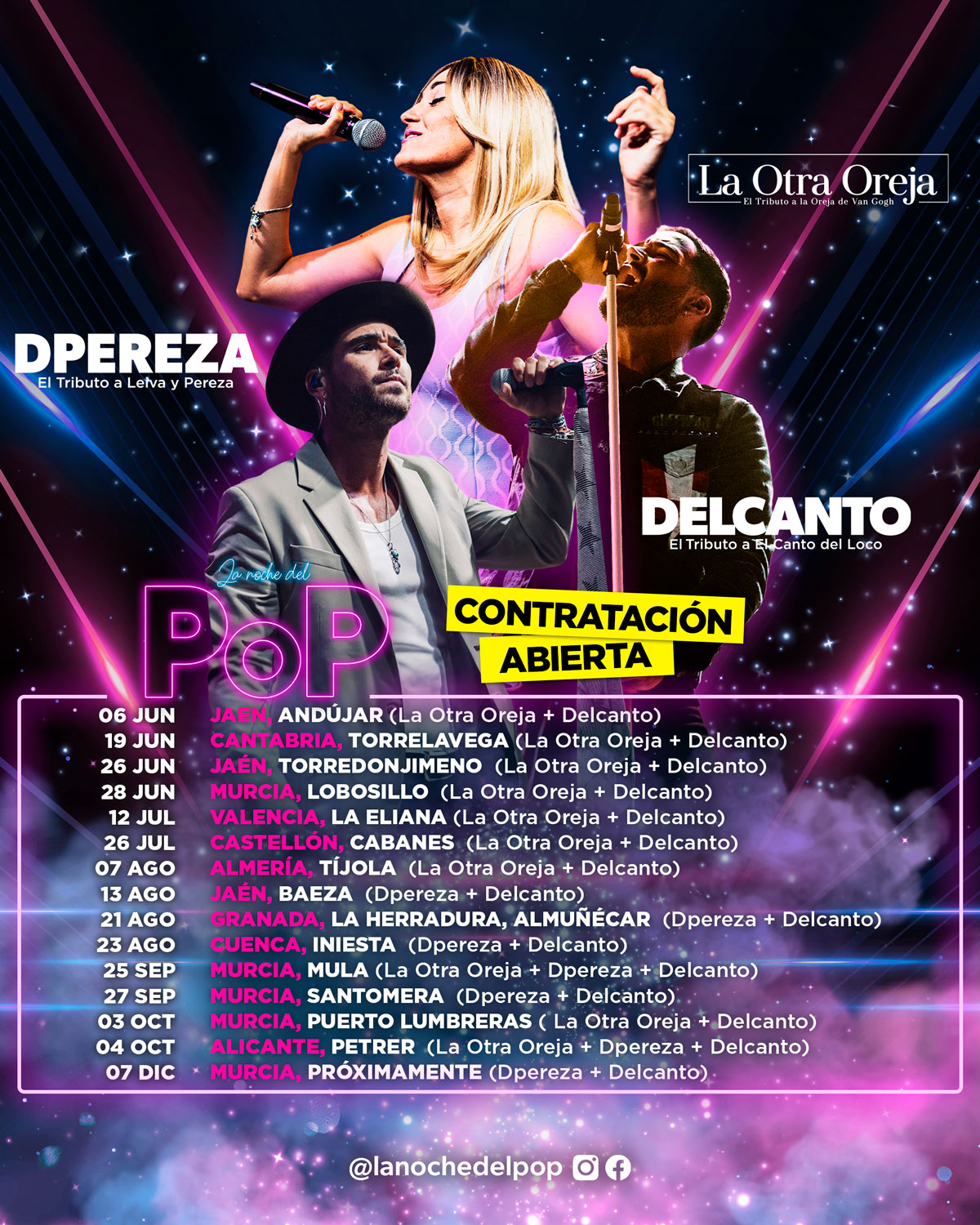Prepárate para un espectáculo único que revivirá los éxitos que marcaron una época dorada de la música española. La Noche del Pop es tu oportunidad de disfrutar, en una sola noche, tres de los tributos más poderosos y emocionantes del panorama musical: DELCANTO (El Tributo a El Canto del Loco), DPEREZA (El Tributo a Pereza) y LA OTRA OREJA (El Tributo a la Oreja de Van Gogh).